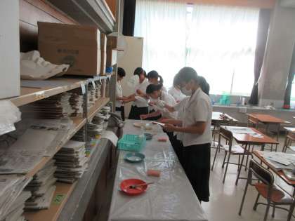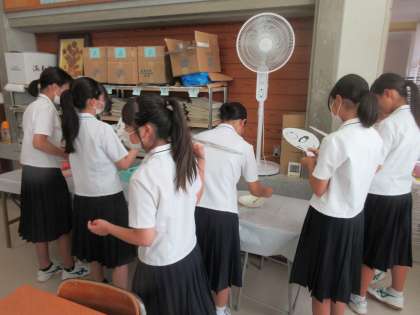 9月5日(火) 2年 授業風景 公開日 2023/09/05 更新日 2023/09/05 2学年 写真は、2年2組の美術の授業の様子です。 水墨画の「うちわ作り」を行っています。 完成した水墨画を団扇の骨組みに貼り付けていました。