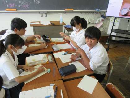 9月5日(火) 1年3組 授業風景 公開日 2023/09/05 更新日 2023/09/05 1学年 本日の3限目の授業の様子です。 教科は家庭科で「おいしさ」を五感で感じることについて学習しました。