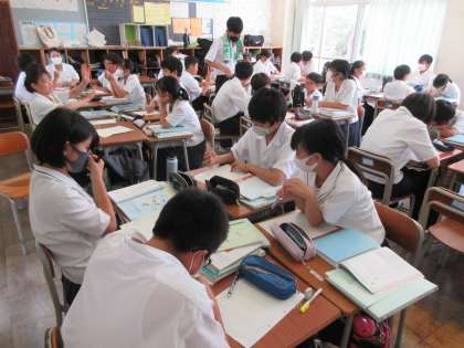 9月5日(火) 1年2組 授業風景 公開日 2023/09/05 更新日 2023/09/05 1学年 本日の3限目の授業の様子です。 教科は数学で牛乳パックとその重さの関係から方程式について学習しました。