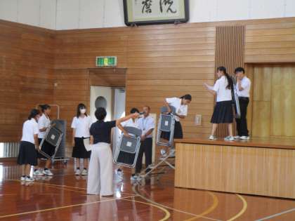 放課後、立ち会い演説会のリハーサルを行いました。選挙管理委員会、立候補者みんなで会場の準備をしました。