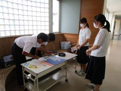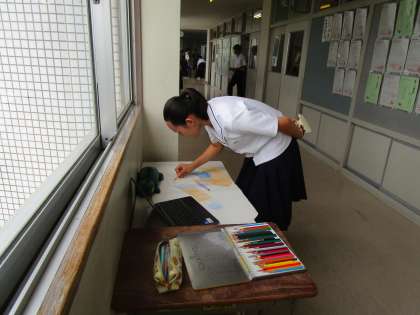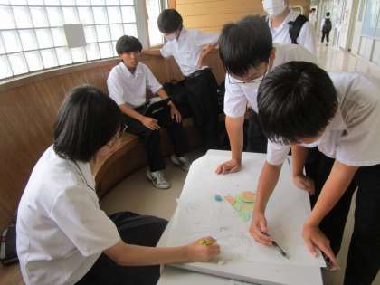 生徒会主催の「玄関を明るくする運動」の掲示物を、2年生各クラスの代表が協力して作成しています。
