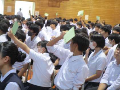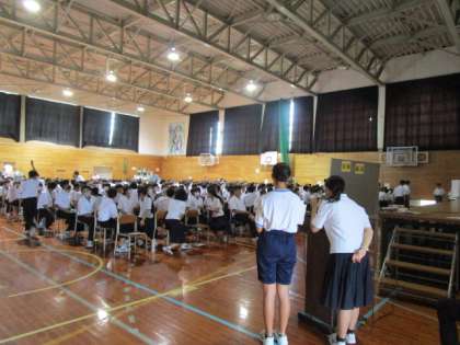 9月11日(月) 生徒会レクリエーション 公開日 2023/09/11 更新日 2023/09/11 news 本日6限、全校生徒が体育館に集まり生徒会主催の全校レクリエーションを行いました。 生徒会執行部の生徒が、様々なクイズを考え出題してくれました。 後半のクイズでは、教員に関わる問題を出題し、大変盛り上がりました。 令和5年度前期の生徒会活動も、残りわずかですが、最後までよろしくお願いします。