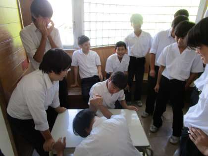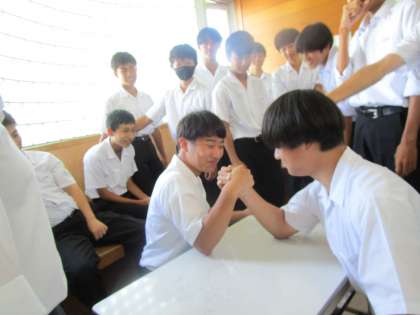 のぞいてみると、、、腕相撲の勝負で盛り上がっていました。