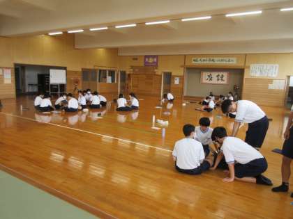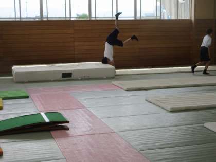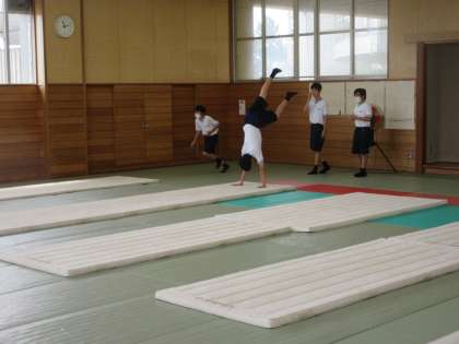 各自、自分の課題とする技の練習をしているグループとタブレット端末で自分の演技を振り返っているグループがありました。