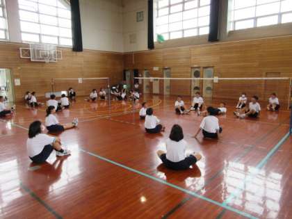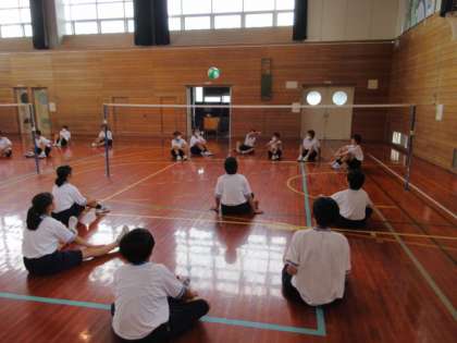 教科は保健体育でビーチボールを使ってバレーボールの基本的な動作を確認しました。
