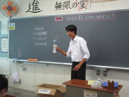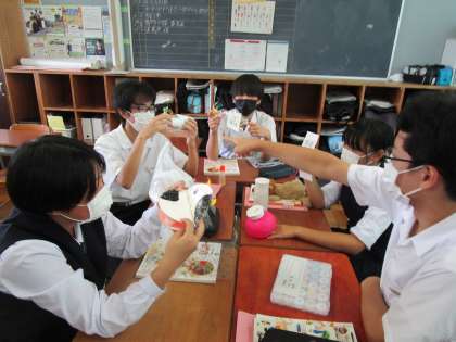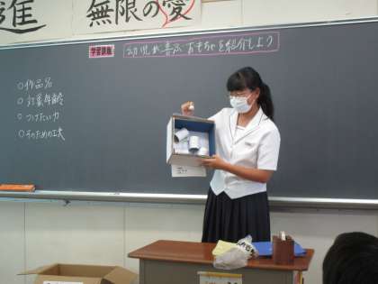 9月20日(水) 3年 幼児が喜ぶおもちゃ発表会 公開日 2023/09/20 更新日 2023/09/20 3学年 3年生の家庭科では、幼児が喜ぶ手作りおもちゃの発表会を行いました。 家庭にある身近なものを使って、幼児の発達段階を考えたおもちゃがたくさんありました。 それぞれ工夫した点を発表した後は、幼児の気持ちになっておもちゃで遊びました。