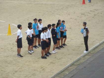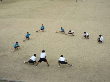 陸上競技部のダウンの様子と最後のミーティングの様子です。