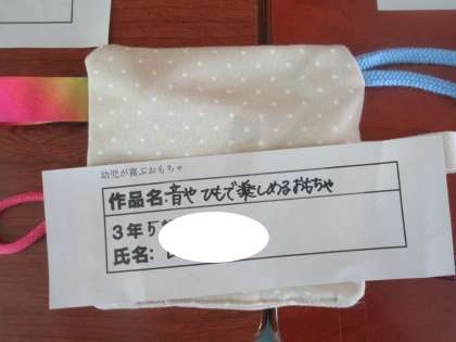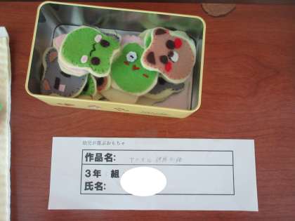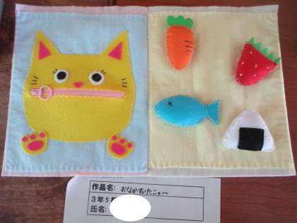 3年 家庭科「幼児が喜ぶおもちゃ」作品展示 5組 公開日 2023/10/01 更新日 2023/10/01 3学年 写真上段 おなかすいたニャー 写真中段 アニマル神経すいじゃく 写真下段 糸やひもで楽しめるおもちゃ