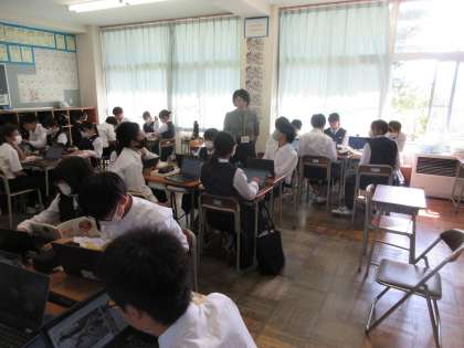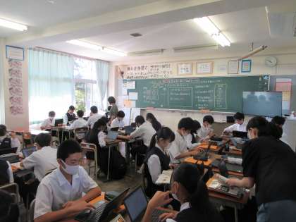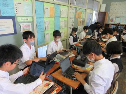 10月4日(水) 1年1組 授業風景 公開日 2023/10/04 更新日 2023/10/04 1学年 本日の3限目の授業の様子です。 教科は家庭科で、タブレット端末を使って豚汁計画表を作成しました。