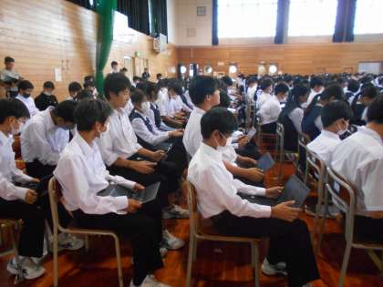 今回の生徒総会の資料は、クロームブックに掲載し、生徒はそのデータを確認しながら話を聞いていました。