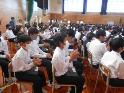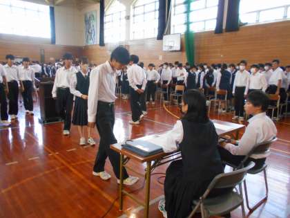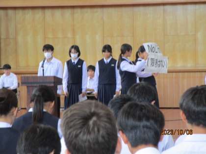 10月6日(金) 令和5年度 後期生徒総会 公開日 2023/10/06 更新日 2023/10/06 生徒会 後期生徒会の計画案が、無事承認されました。 今年の生徒会スローガンは「No limit(限界はない)」です。限界を決めずに自分自身の可能性を広げていこうという意味が込められています。 後期生徒会も、一人一人が積極的に生徒会活動に参加し、盛り上げていきましょう!