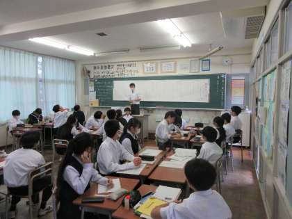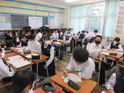 1組は合唱コンクールのクラス合唱の曲の意味を確認し、どのように歌うかみんなで共通理解を図っていました。