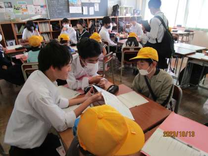 藤ノ木小学校の2年生が、学校探検にやってきました。3年生が、校舎内を案内したりインタビューを受けたりしました。