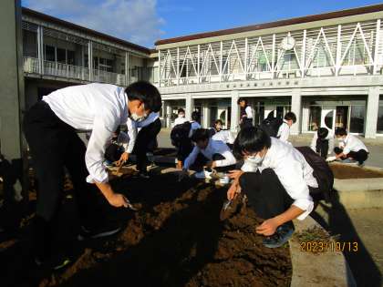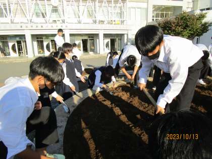 10月13日(金) 花壇ボランティア 公開日 2023/10/13 更新日 2023/10/13 news 放課後、花壇の秋植えに向けて花壇を整備しました。美化委員に加え、ボランティアの生徒も多く参加してくれました。雑草や古い根っこを抜き、肥料と土を混ぜ、なかなかの重労働でしたが、みんなで協力して頑張りました。