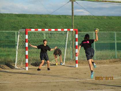 ハンドボールのシュート練習です。放課後の学年や委員会の活動でメンバーは少ない中ですが、元気に頑張っています。