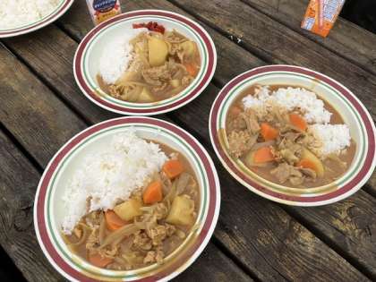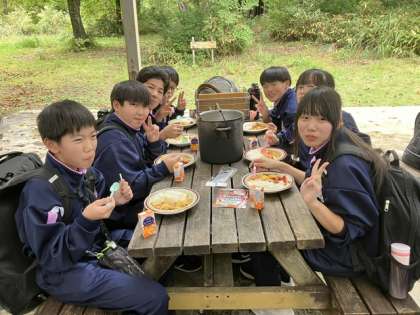 ついにカレーが完成しました!にこにこでカレーを頬張ります! 1組1〜4班、4組の様子です。