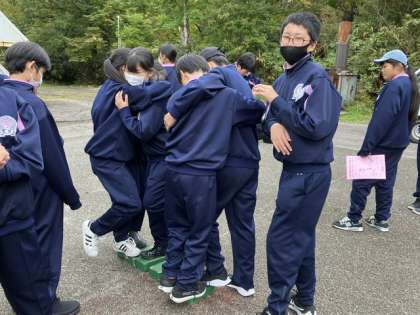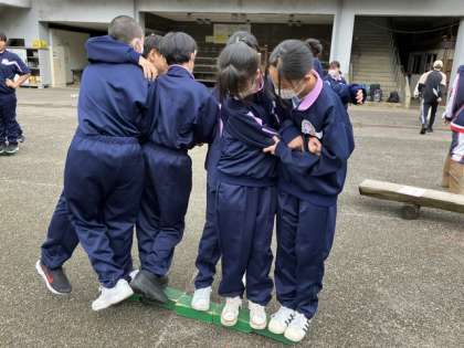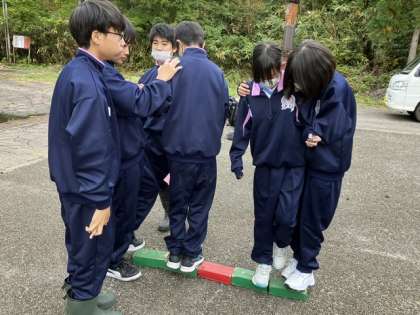 午後は仲間づくりゲームです。1組は少ないブロックに班員全員が登る日本列島からスタートします。