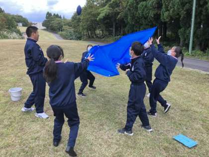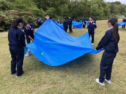 10月16日(月) 1年 校外学習 16 公開日 2023/10/16 更新日 2023/10/16 1学年 3組はブルーシートの上のボールを班員で協力しながらバケツに入れるバケットボールからスタートです。