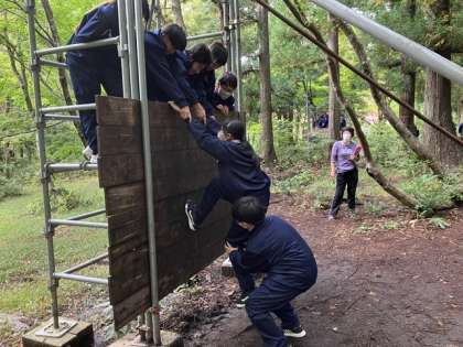 4組は2メートル近くある壁を班員で協力しながら登るウォールからスタートです。がんばれ!と声援が飛んでいます。