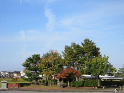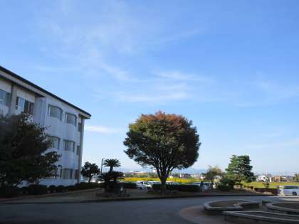 今日は青い空に白い雲。 そして、校庭の緑の木々と紅く染まった木々。