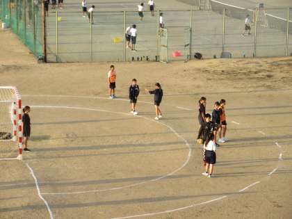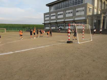 ハンドボール部は、ディフェンスを付けて実践的なシュート練習を行っていました。