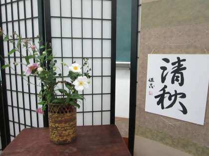 今日の茶席のテーマは、「さわやかな秋」ということでテーマに沿った掛け軸、花、器等に工夫を凝らしていました。