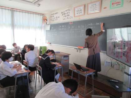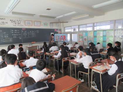 本日の3限目の授業の様子です。 教科は家庭科で豚汁作りの材料について学習しました。