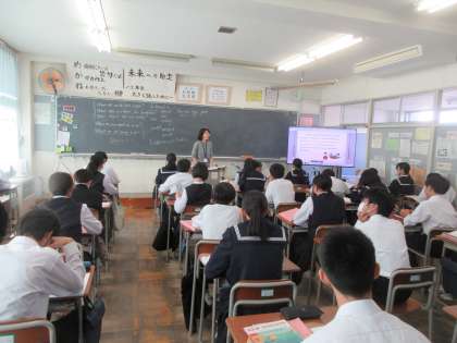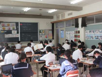 2年生の今日の授業の様子です。 写真上段 2−1 英語 写真下段 2−2 美術