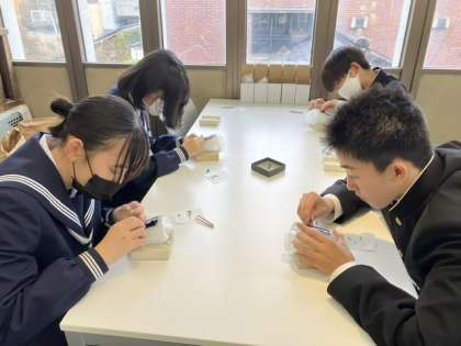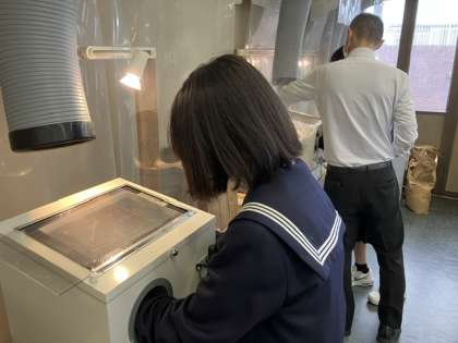 写真は砂ガラス彫り体験です。好きな図柄を選び、シールをカットして砂で、ガラスを削ります。