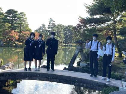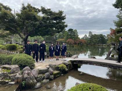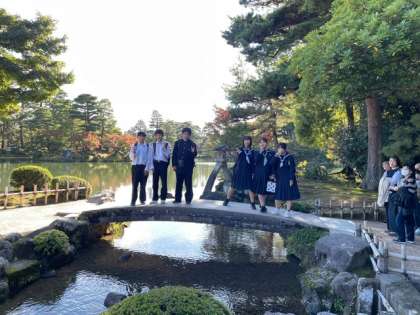 兼六園では琴柱灯篭の前で記念撮影です。風情がありますね!