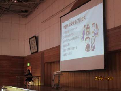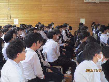 11月1日(水) 3年 学校保健委員会 公開日 2023/11/01 更新日 2023/11/01 news 3年生は、学校保健委員会の講演会を実施しました。 講師はスクールカウンセラーの中塩先生です。 演題は、「自分の人生は、自分でつくる」でした。 「自分の中にある底力を信じ、自分のこれからを誰かのためにではなく、自分のために自分の人生を自分で作っていこう!」とお話があり、これから自立を図る3年生に勇気をいただけるとても素敵なお話でした。