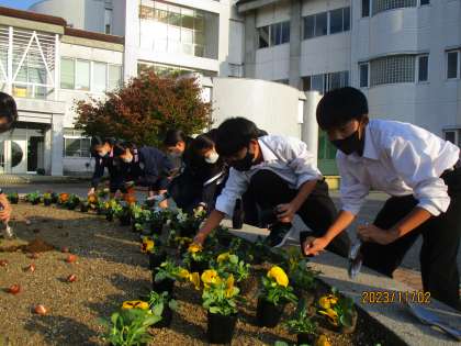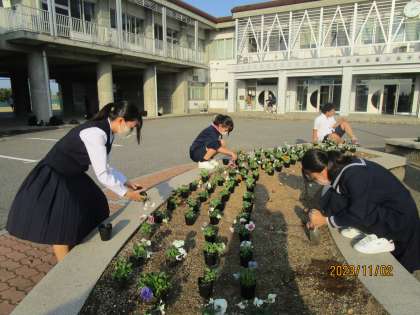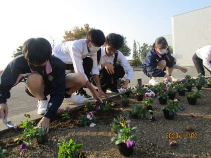 11月2日(木) 花の秋植え 公開日 2023/11/02 更新日 2023/11/02 生徒会 放課後の花壇では、美化委員会が苗植えをしています。 ボランティアの生徒も加わって、どんどん花壇が明るくなっていきます。 ありがとうございました!
