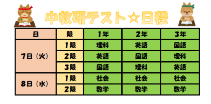 11月7日(火)・8日(水) 中教研テストの予定 公開日 2023/11/04 更新日 2023/11/05 news 来週11月7日(火)・8日(水)は中教研テストです。 週末を利用して、テストに向けてしっかり準備をしていきましょう!