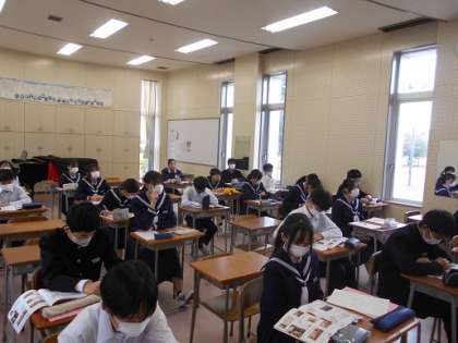 上の写真は、2年1組の6限の学活の様子です。期末考査のテスト範囲を確認しながら計画を立てていました。