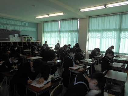 上の写真は、2年3組の数学の授業風景です。既習事項を確認するために、数学ワークの問題に取り組んでいました。