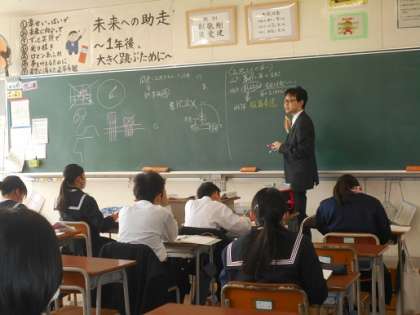 下の写真は、2年4組の社会の授業風景です。テストが返却され、教師の解説を真剣に聞いていました。