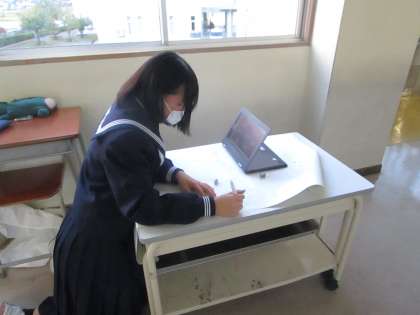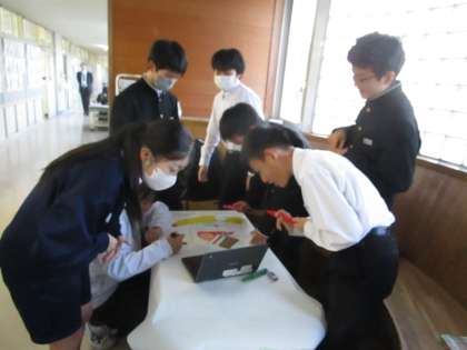 放課後の2年生の教室では、楽しそうに活動する姿があります。生徒会企画の「玄関を明るくする運動」に向けて、各クラスの個性溢れる掲示物を作成しています。
