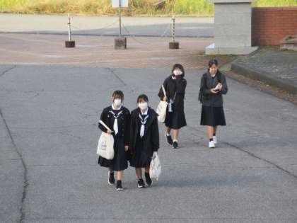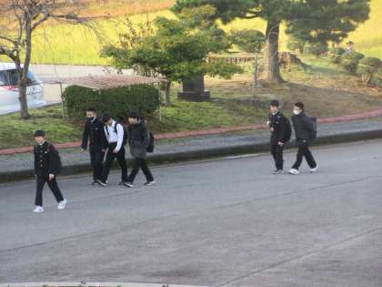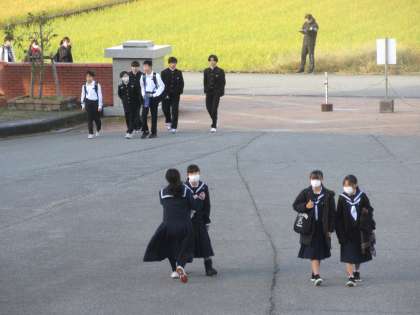 11月15日(水) 登校風景 公開日 2023/11/15 更新日 2023/11/15 news 今朝の登校風景です。 今日から期末考査のテスト期間で部活動停止となります。 1、2年生は、4限後、終学活、給食、5・6限の授業後、清掃、終礼を行い16:00頃に下校する予定です。 3年生は、本日より3日間進路懇談会を行います。 4限後、終学活、給食を食べて、終礼をして12:50頃放課となり、13:30から進路懇談会を行います。