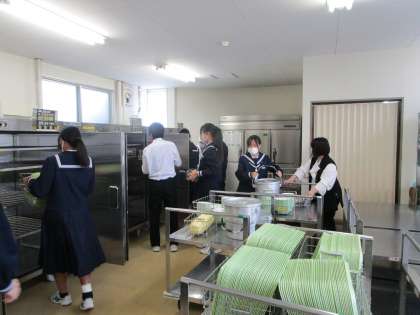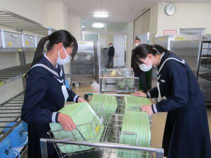 昼休みの給食室では、委員会の生徒がワゴンで運ばれてきた食器や食缶等をコンテナに片付けています。毎日ありがとうございます!