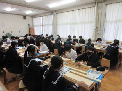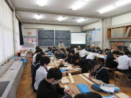 本日の4限目の授業の様子です。 教科は技術で材料に「けがき」をしました。