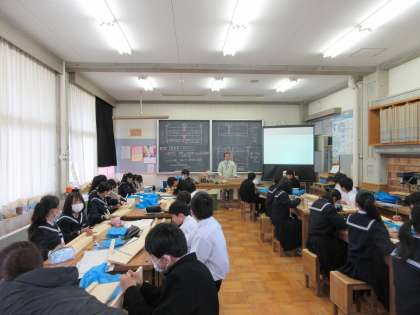 本日の3限目の授業の様子です。 教科は技術で木材に「けがき」しました。