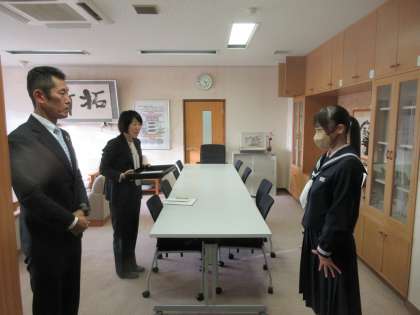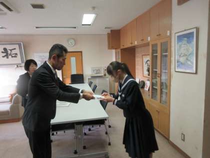 本日、全国大会に出場した新体操部の生徒に 教育後援会ならびにPTA「藤波の会」からの激励費を鍋田校長が手渡しました。
