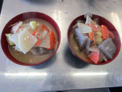 11月21日(火) 1年 五感が喜ぶ豚汁づくり 公開日 2023/11/21 更新日 2023/11/21 1学年 1年3組の家庭科では、「五感が喜ぶ豚汁」を作りました。3組は、前半、後半のペアがしっかりと相手のサポートに入って、アドバイスし合いながら実習を行っていました。 片付けも協力してピカピカになりました!