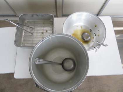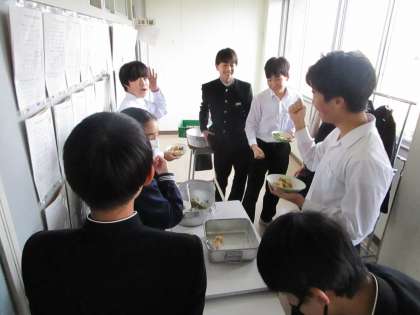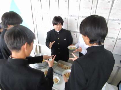 3年生は、人気の鶏の唐揚げを囲んで、じゃんけんでおかわりタイムです。食欲旺盛で、食缶は空っぽです!