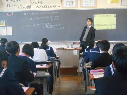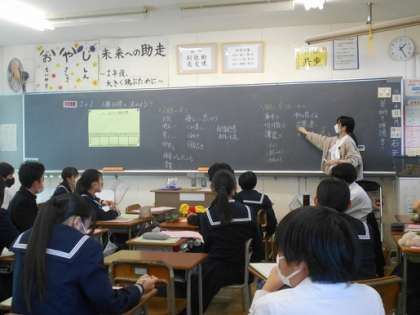 上の写真は、2年1組の様子です。教師の思いも聞きながら、生徒たちは自分自身を振り返って目標を設定していました。
