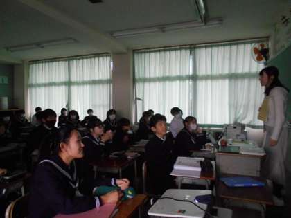 上の写真は、2年3組の英語の授業風景です。アニメのキャラクターの身長を比べる英文を学び、どの生徒も興味をもちながら課題に取り組んでいました。