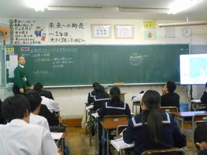 下の写真は、2年4組の理科の授業風景です。前線周辺はどのような気象になるかという課題で、生徒たちは教師の解説を聞きながら、真剣にノートをとっていました。