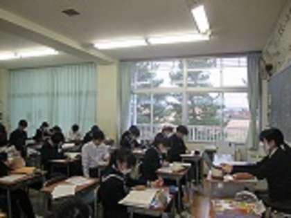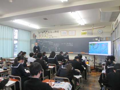 下の写真は、2年2組の理科の授業風景です。前線と気象にはどのような関係があるのかという課題でした。教師の解説を聞きながら、ノートに天気図や前線の種類を自分なりにまとめていました。