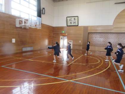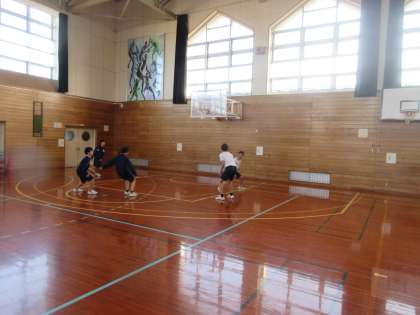 バスケットボールでディフェンスがいる中でシュートを決める練習を行っています。