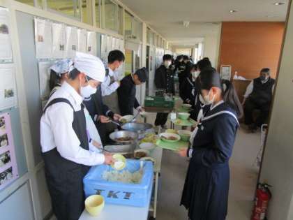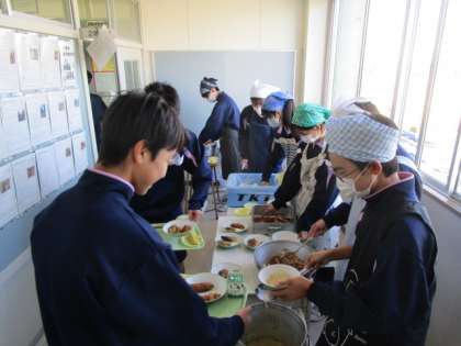 今日は和食メニューです。協力してテキパキ準備をしています。 写真上:2年1組 写真下:2年2組